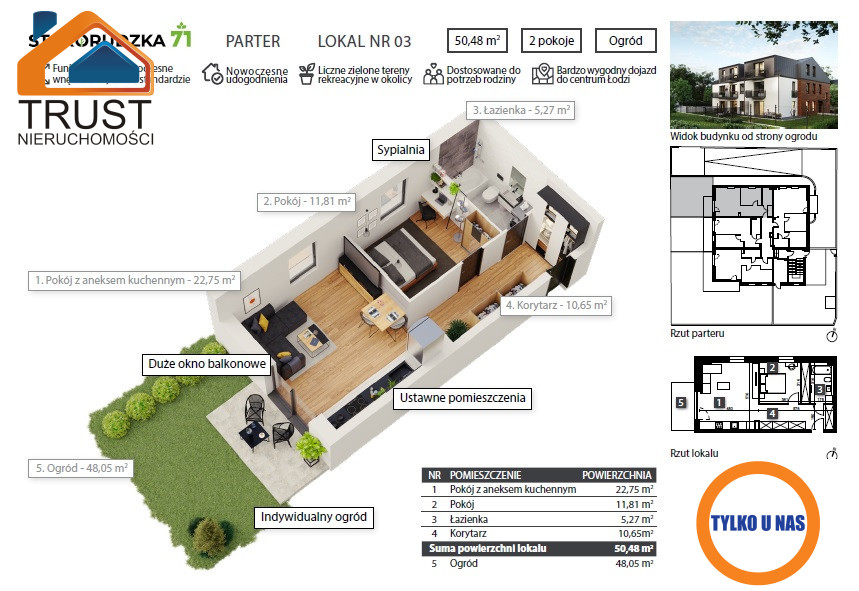 Starorudzka 71 to kameralna inwestycja, obejmująca tylko 11 przestronnych mieszkań, rozlokowanych na trzech kondygnacjach nowoczesnego, ale jednocześnie bardzo eleganckiego budynku. Do wyboru pozostają 2 i 3-pokojowe lokale o powierzchniach od 42 m² do 64 m². Trzy mieszkania na parterze mają prywatne ogródki, natomiast lokale na piętrach posiadają balkony. Wszystkie mieszkania charakteryzuje bardzo funkcjonalny układ pomieszczeń - łatwy w aranżacji i wygodny w codziennym użytkowaniu. Do każdego lokalu przewidziane jest miejsce postojowe w podziemnej hali parkingowej oraz praktyczna komórka lokatorska.