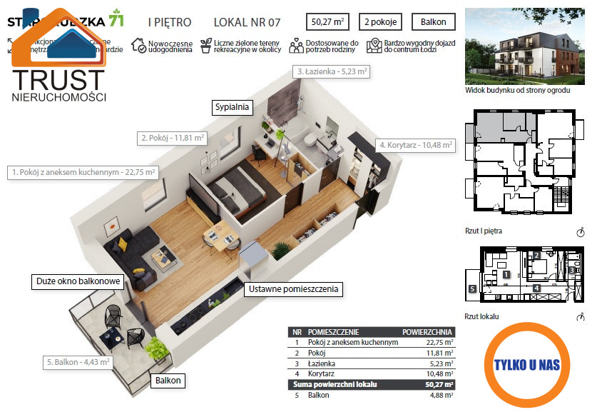 Bardzo bogata infrastruktura handlowo-usługowa: Port Łódź, IKEA w odległości 5 minut samochodem, natomiast LIDL, Biedronka w zasięgu krótkiego spaceru.